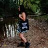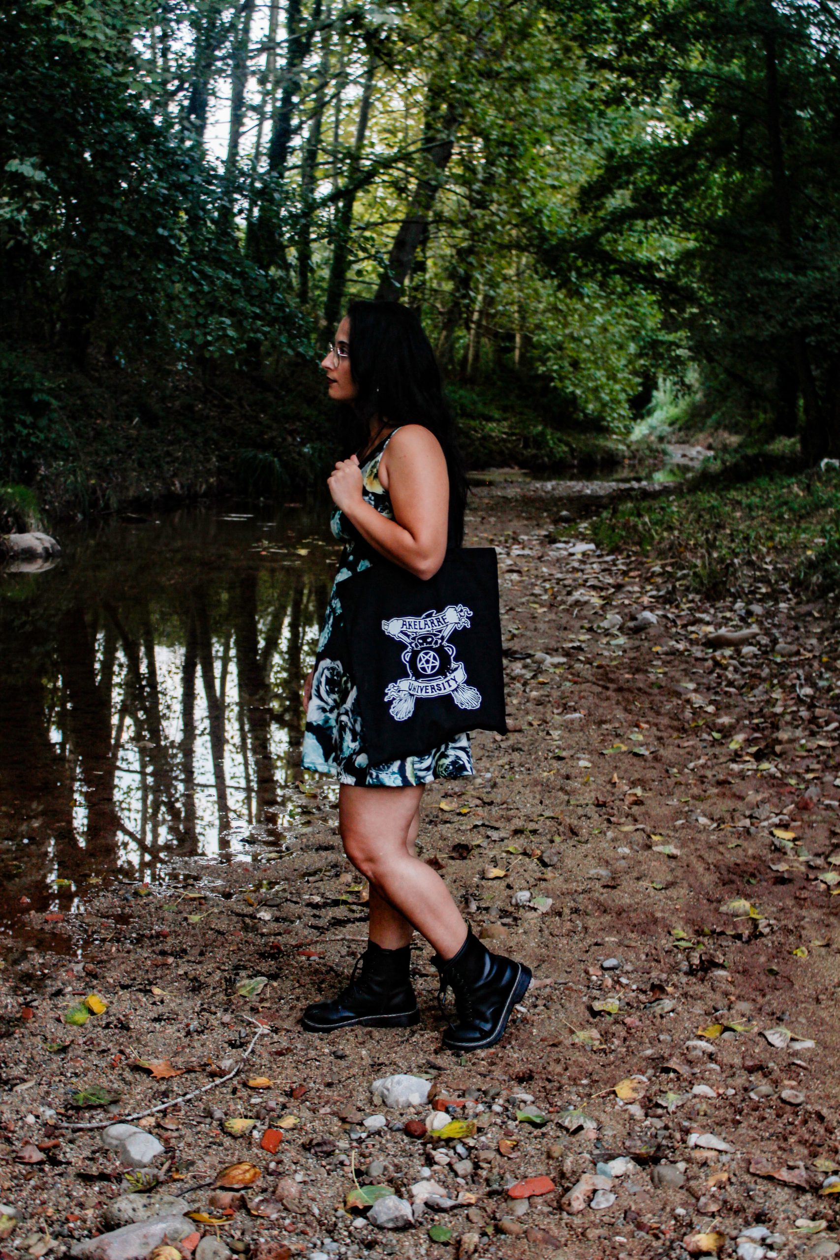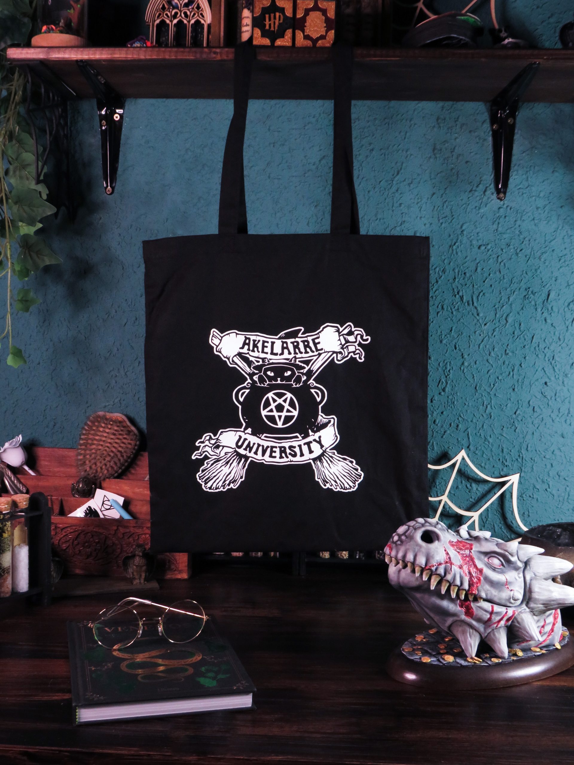 Tote bag negra con el logo del Akelarre University en vinilo blanco.