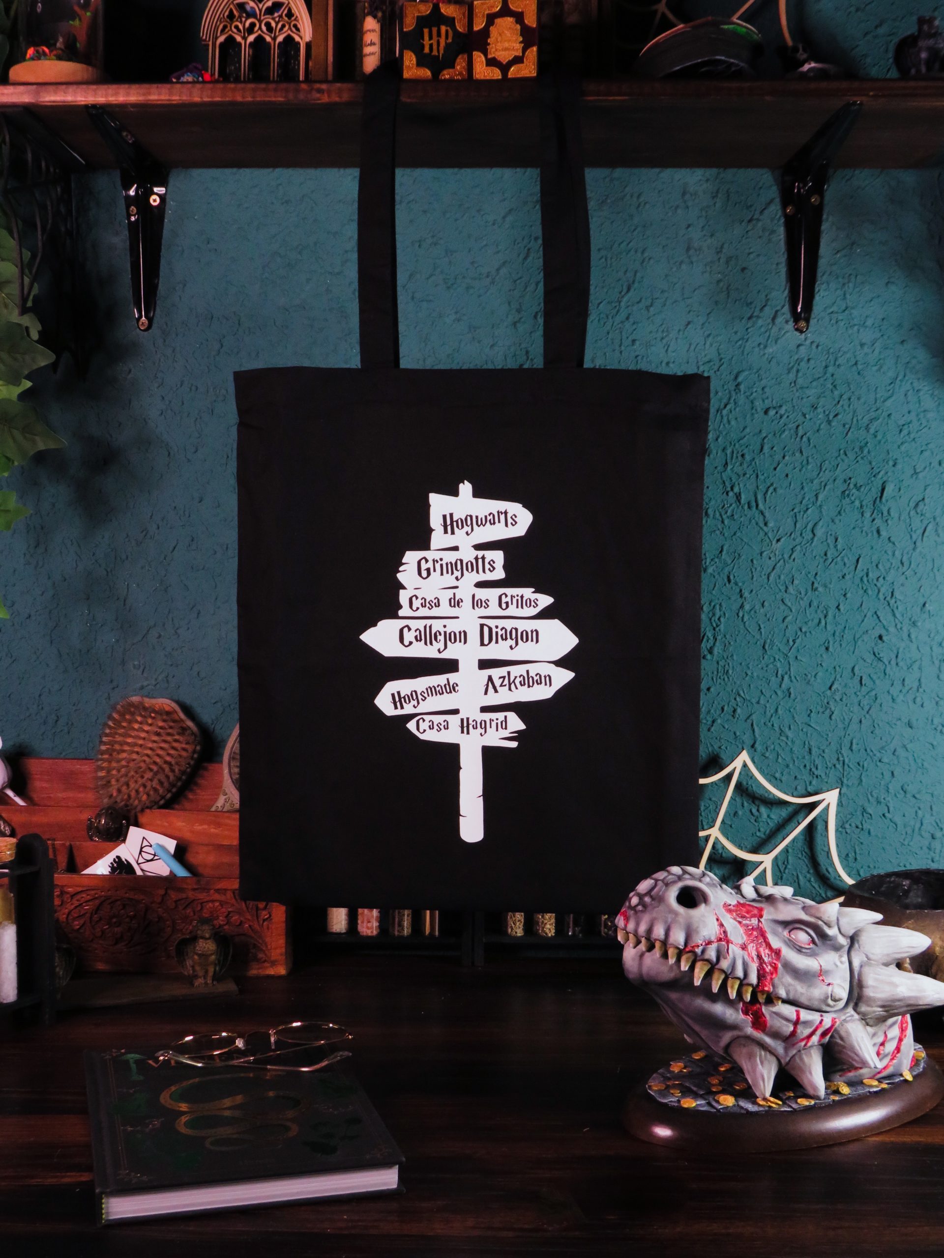 Tote Bag negra con una imagen de un poste con carteles a sitios emblematicos del mundo de Harry Potter en vinilo blanco.