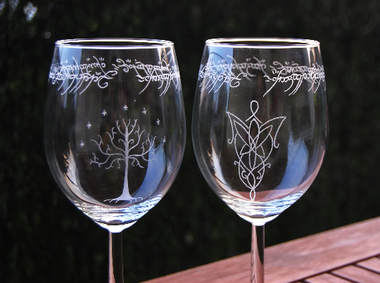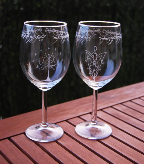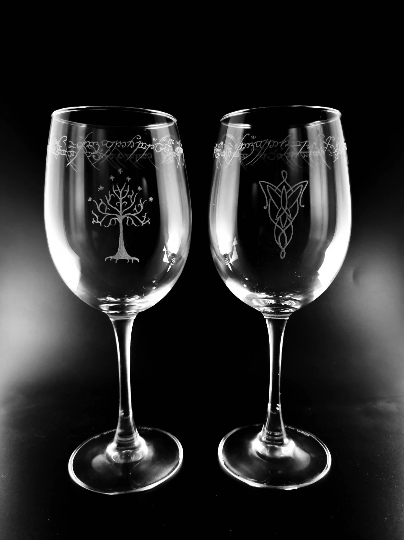 Pack pareja compuesto por dos copas de vino con la frase del anillo único en la parte superior y los dibujos del Arbol blanco de Gondor que representa a Aragorn y la Estrella del Atardecer que representa a Arwen.