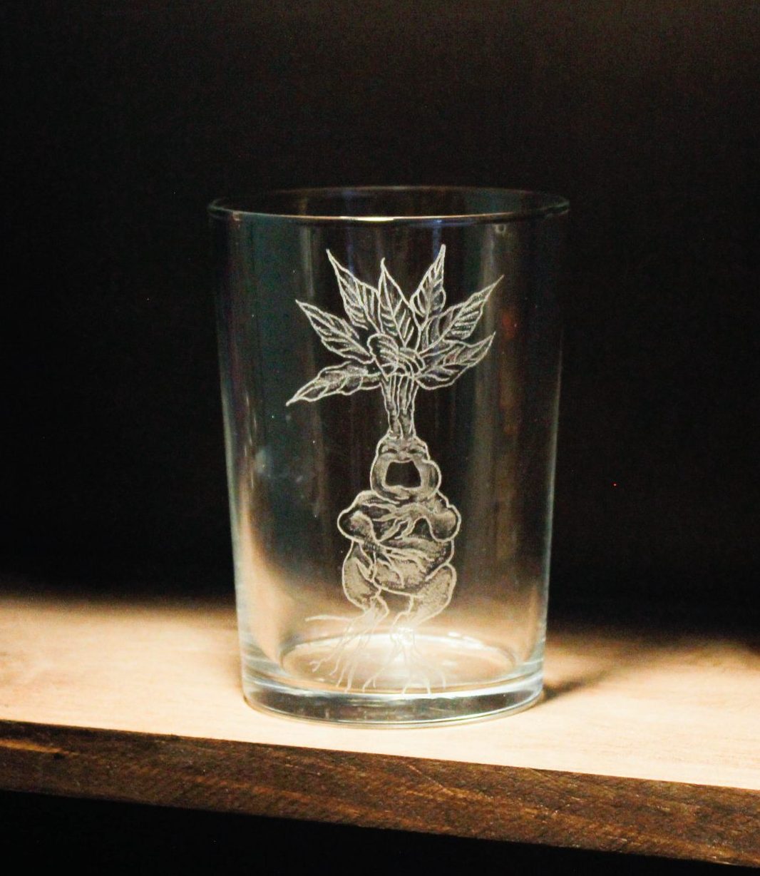 Vaso de sidra con el grabado de una Mandrágora apunto de ser cosechada