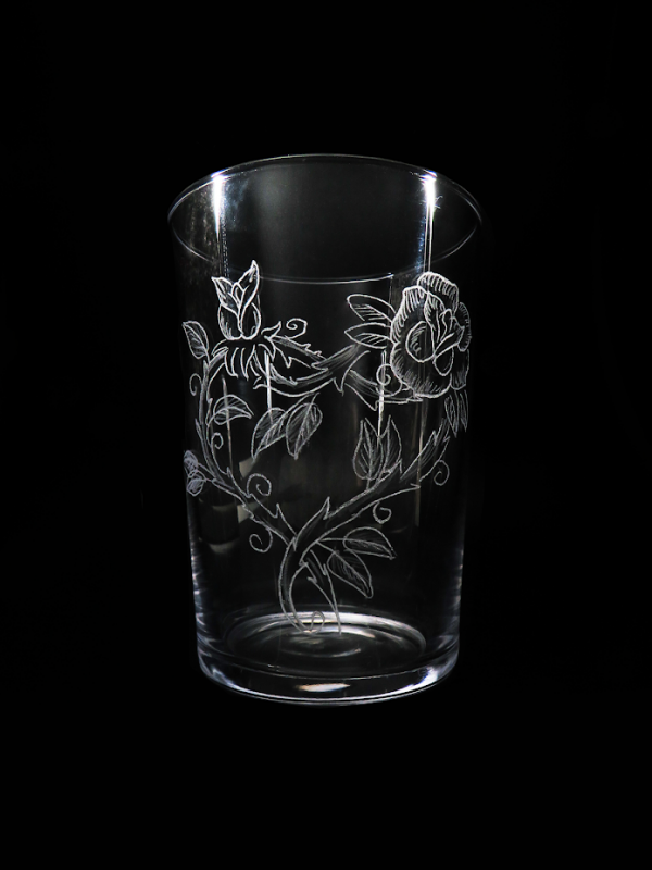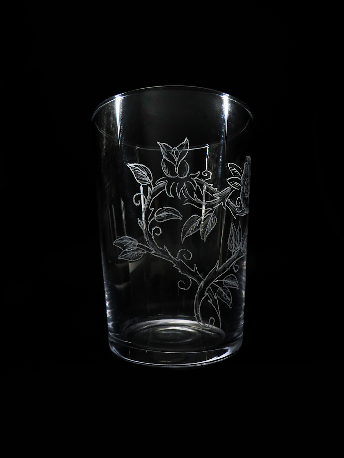 Vaso de 50cl con grabado de un rosal en forma de corazón.